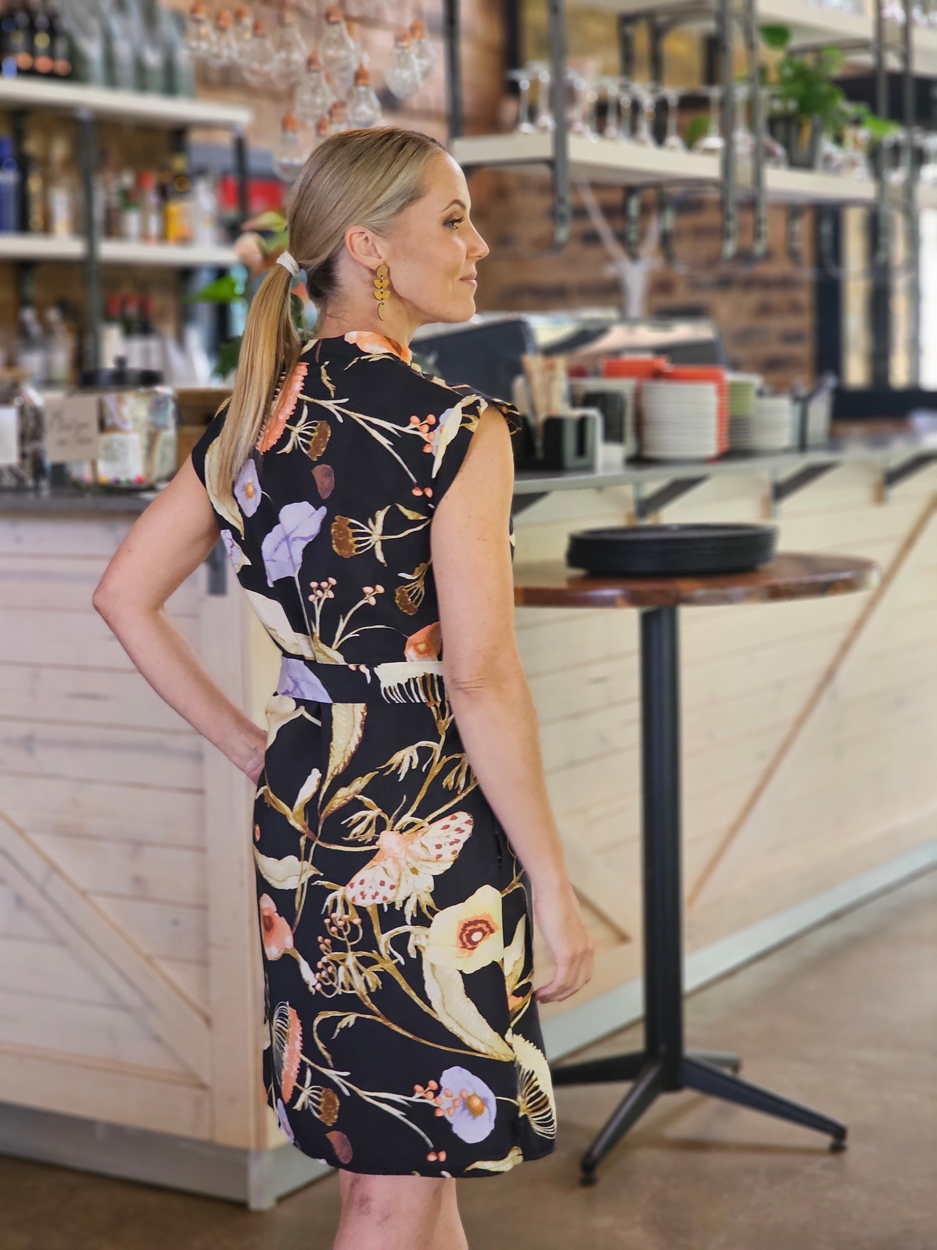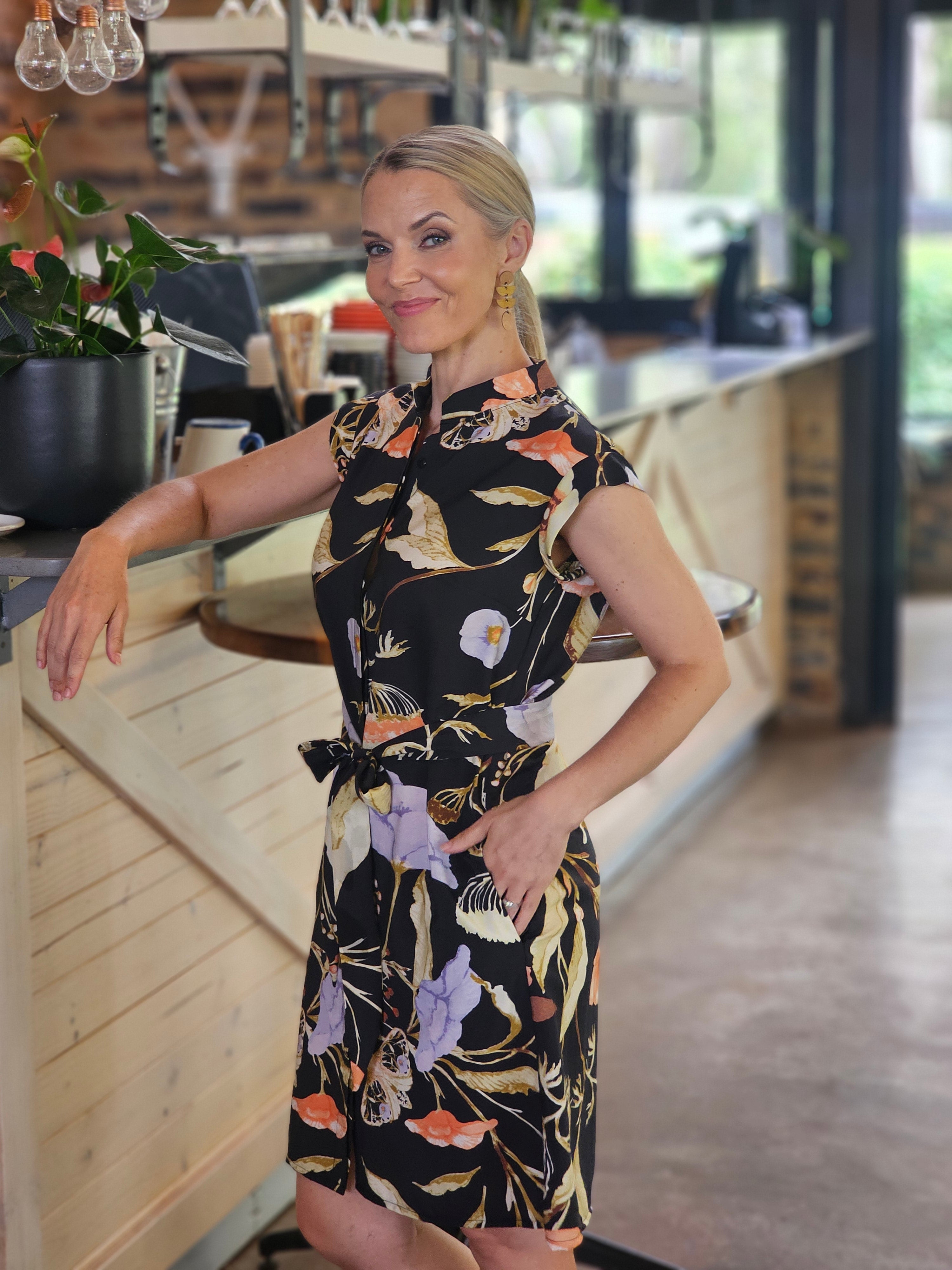 Bring a touch of elegance into a easy to wear every-day-dress with out beautiful button through, mini dress. Completed with side pockets, concealed button stand detailing and a self belt.