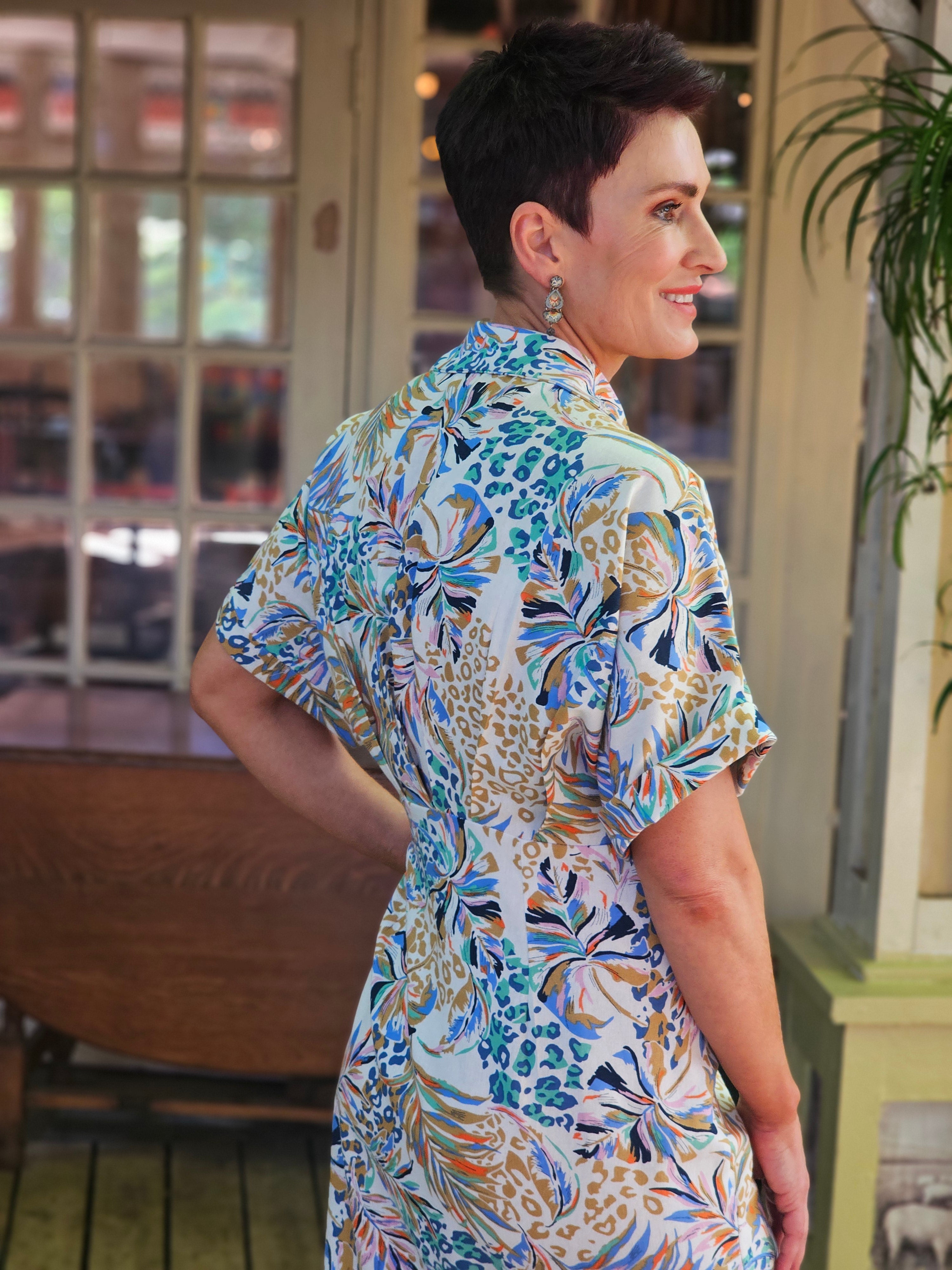 Style: Midi length wrap dress with a collar and short sleeves.