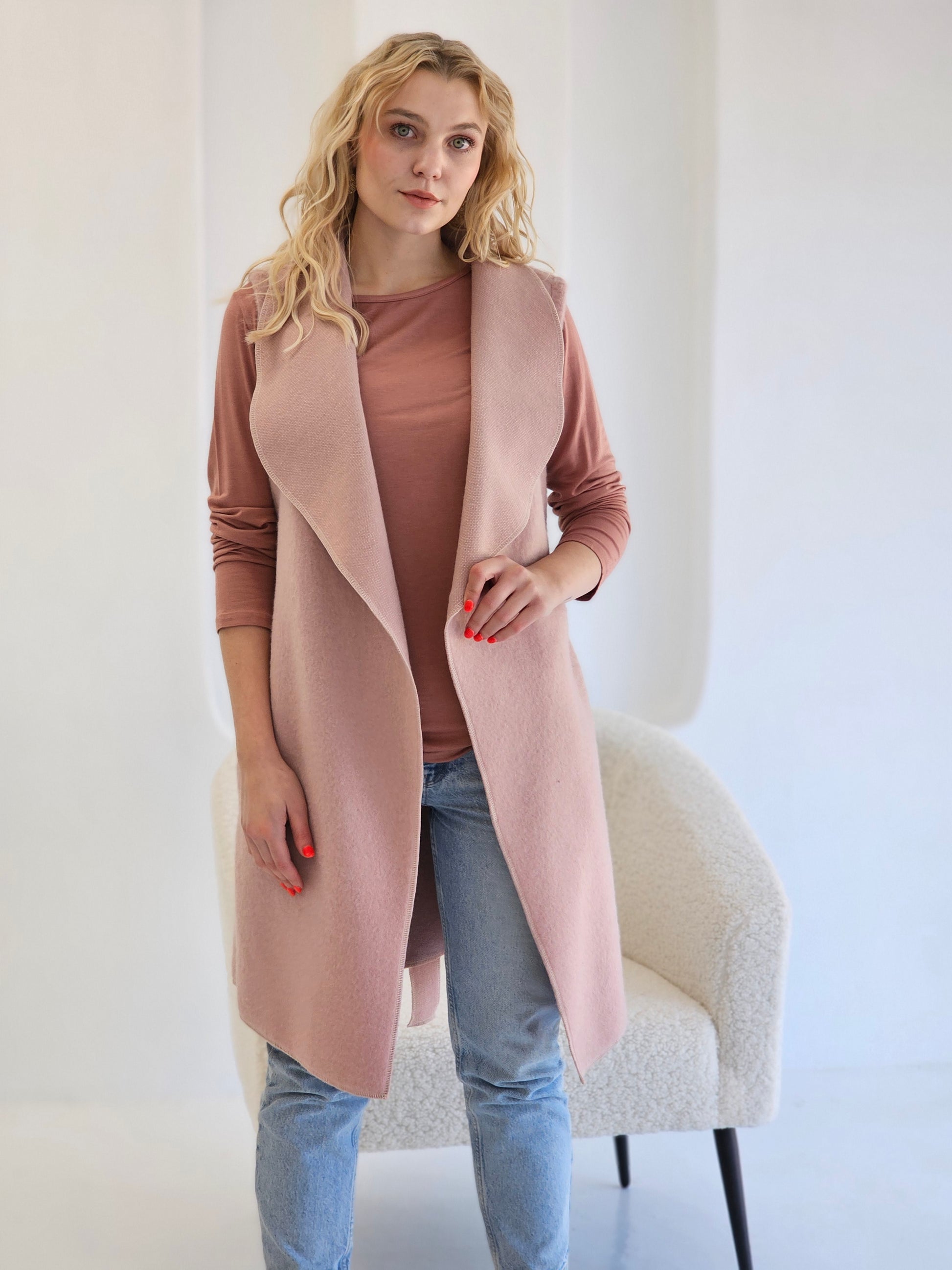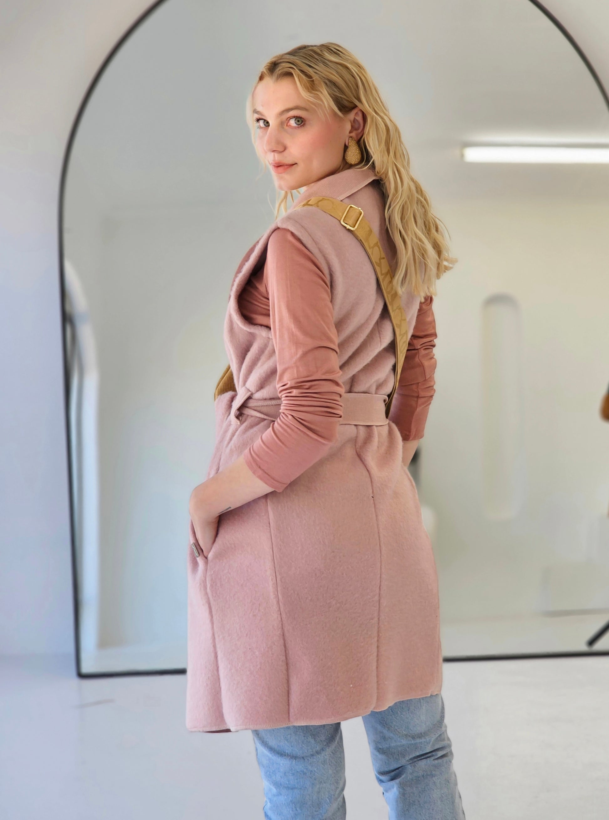 Style : Sleeveless overcoat with side pockets and a fabric waist belt