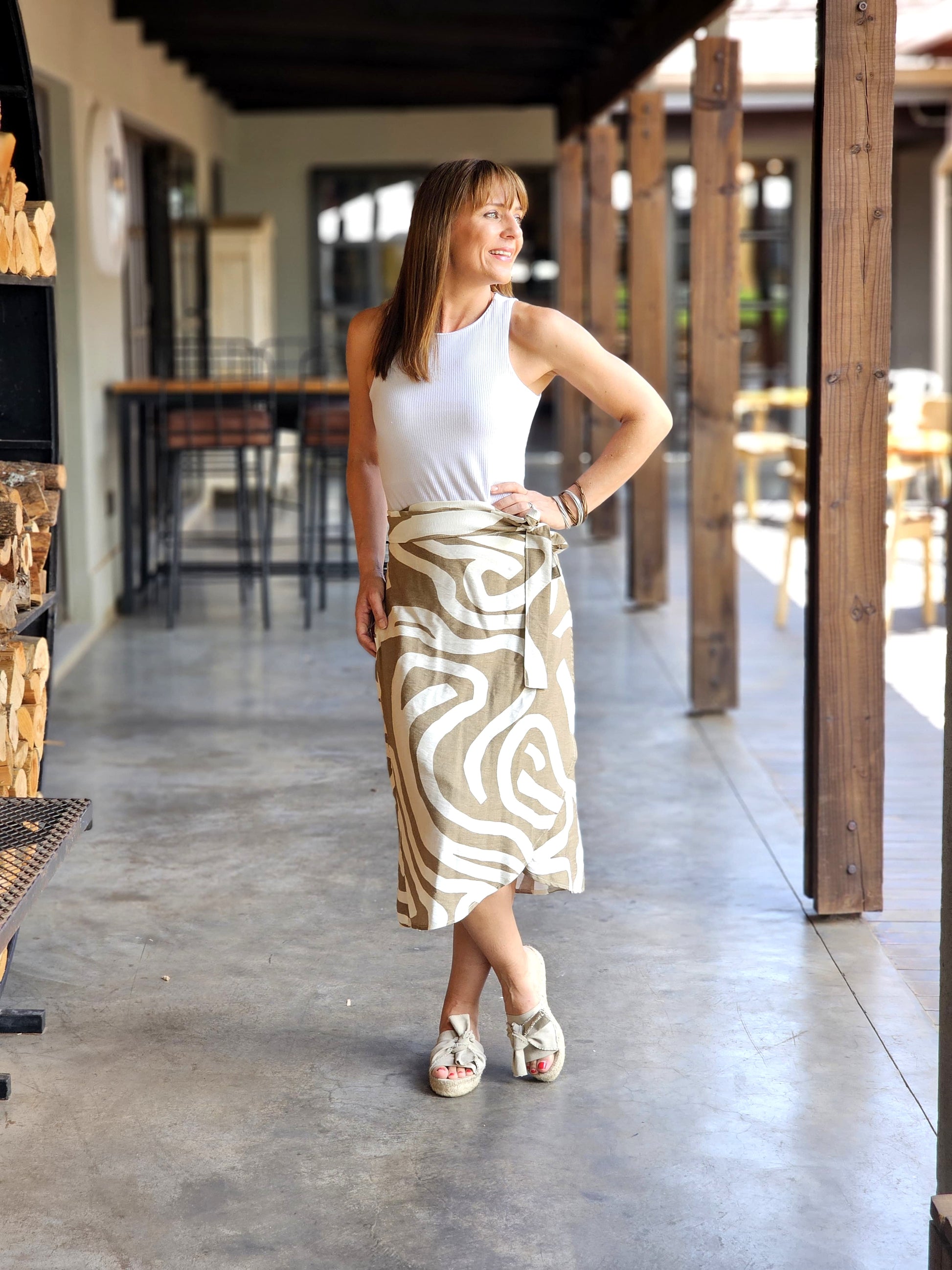 Midi wrap skirt made in a soft printed poly twill. Ideal for travelling. Mix and match with a variety of tops