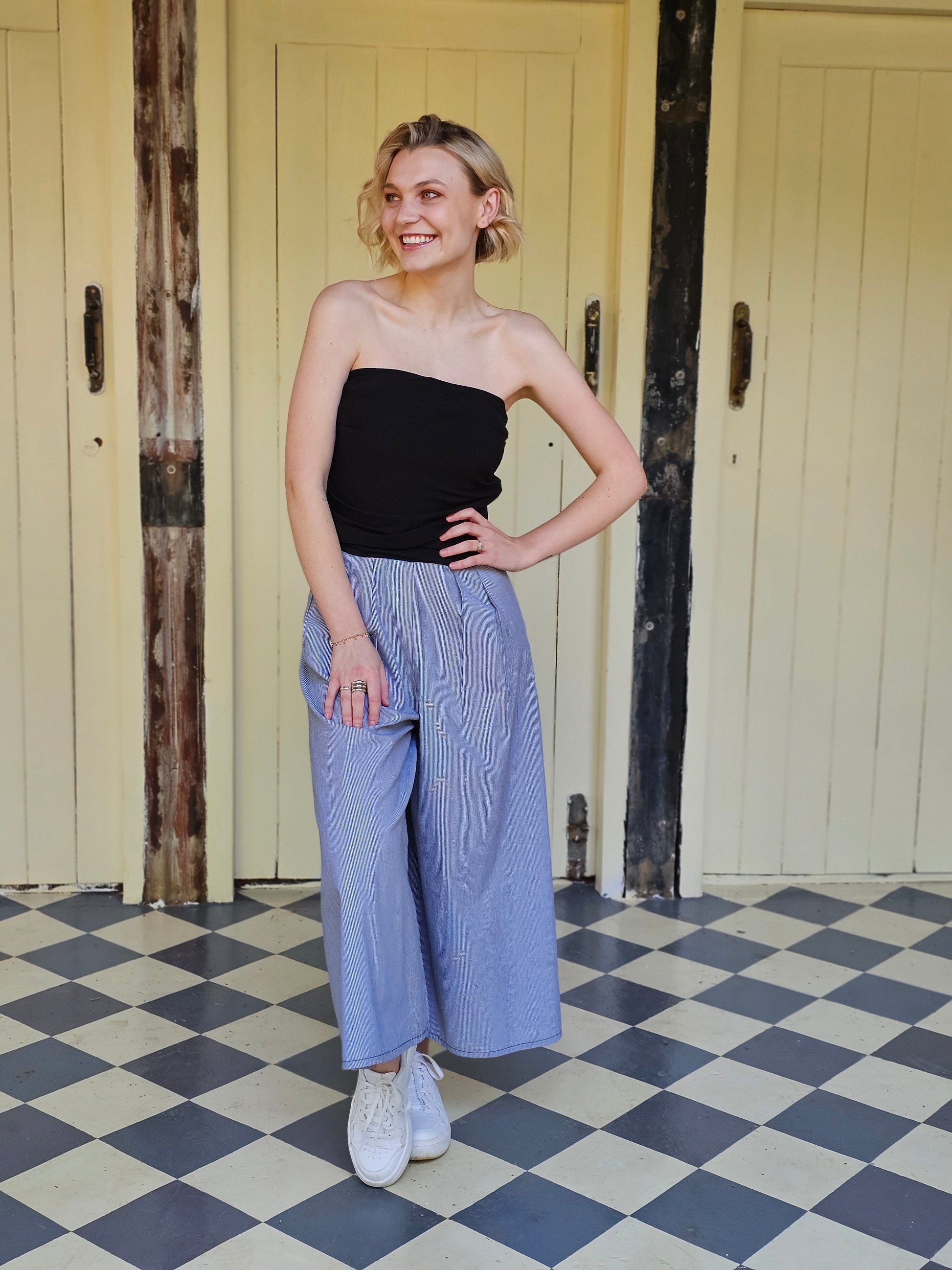 She is trendy and she is fun, made from a gorgeous soft bamboo cotton blend ribbed bodice and finished with a wide leg pleated pencil stripe bottom. Throw her on for an effortlessly trendy look.