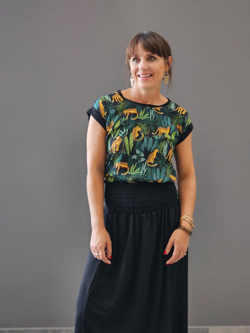 A beautifully versatile A-line skirt with a basque elasticated waistband. Wear it as a skirt or pull it up for a fun boob-tube style dress.