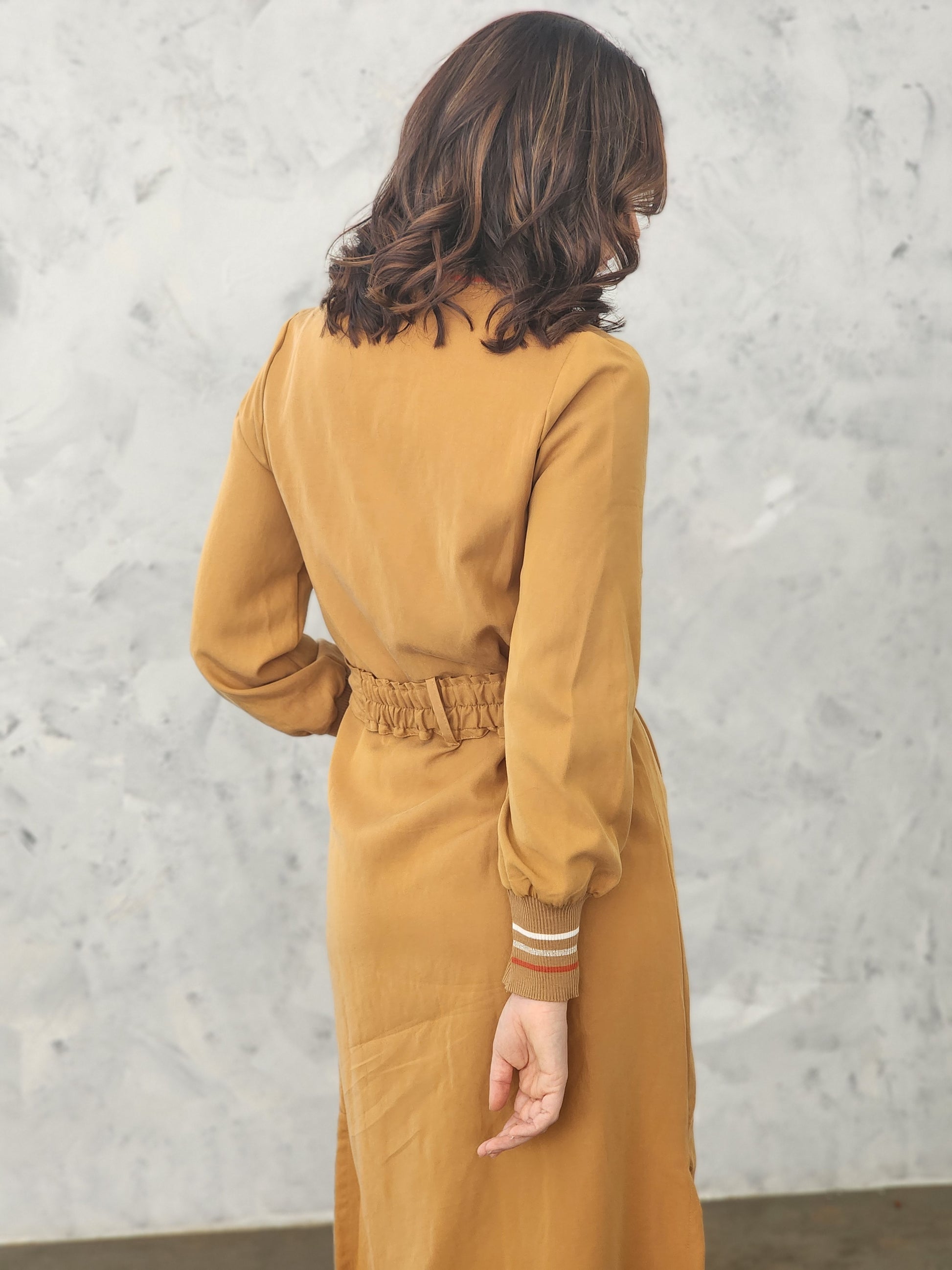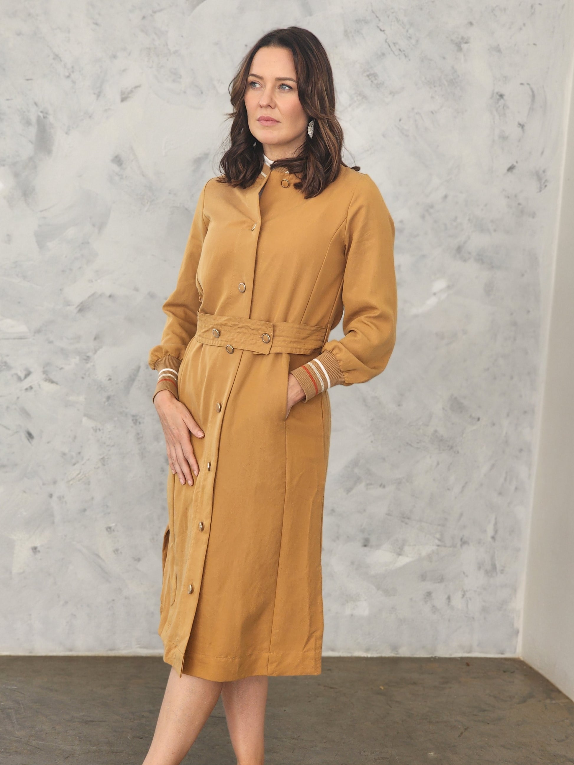 Light weight long coat. Soft peach skin fabric with a ribbed cuff and collar. This coat comes with a seperate rouched belt. Not lined - so a perfect piece for cooler summer days or evenings
