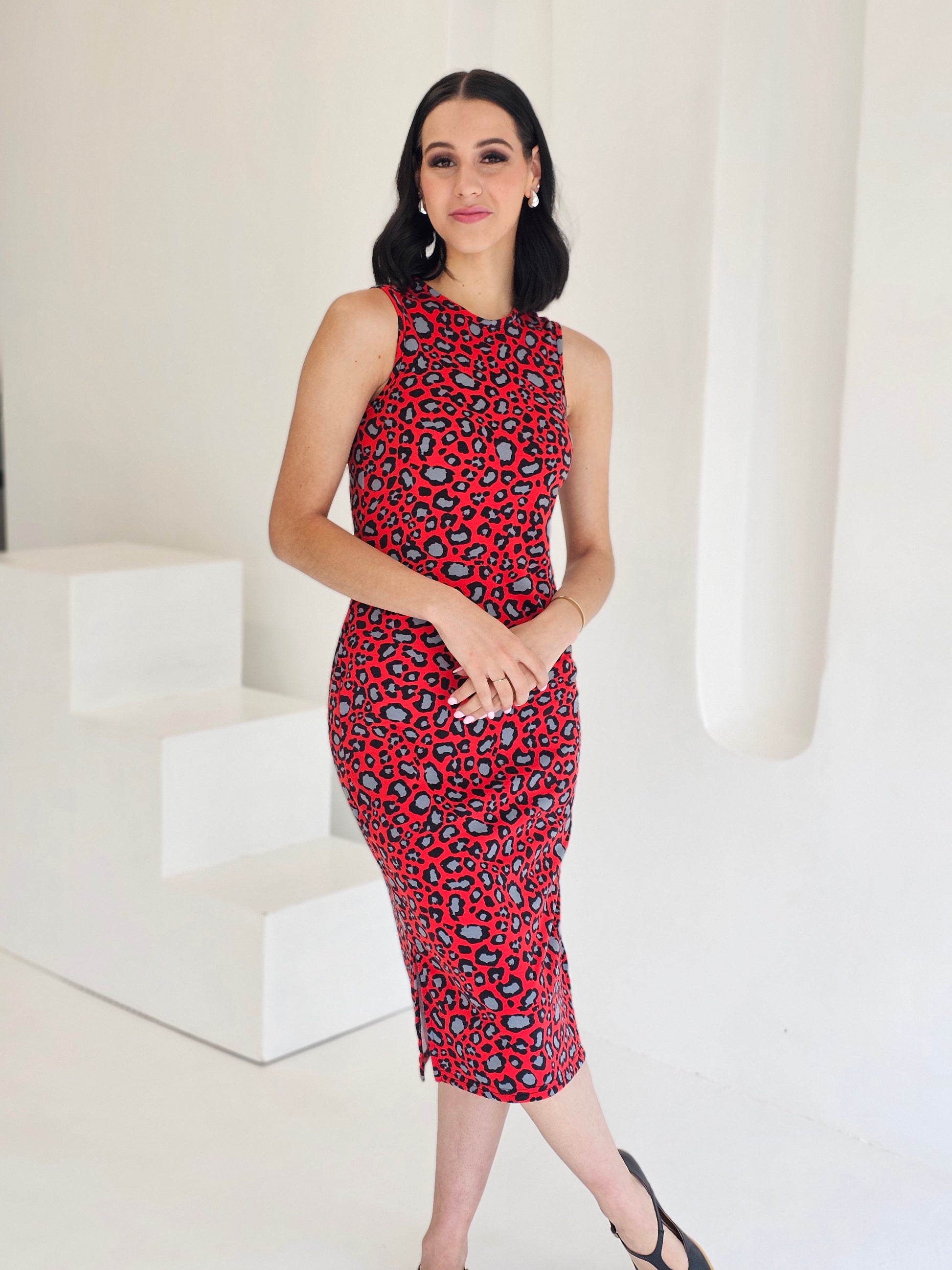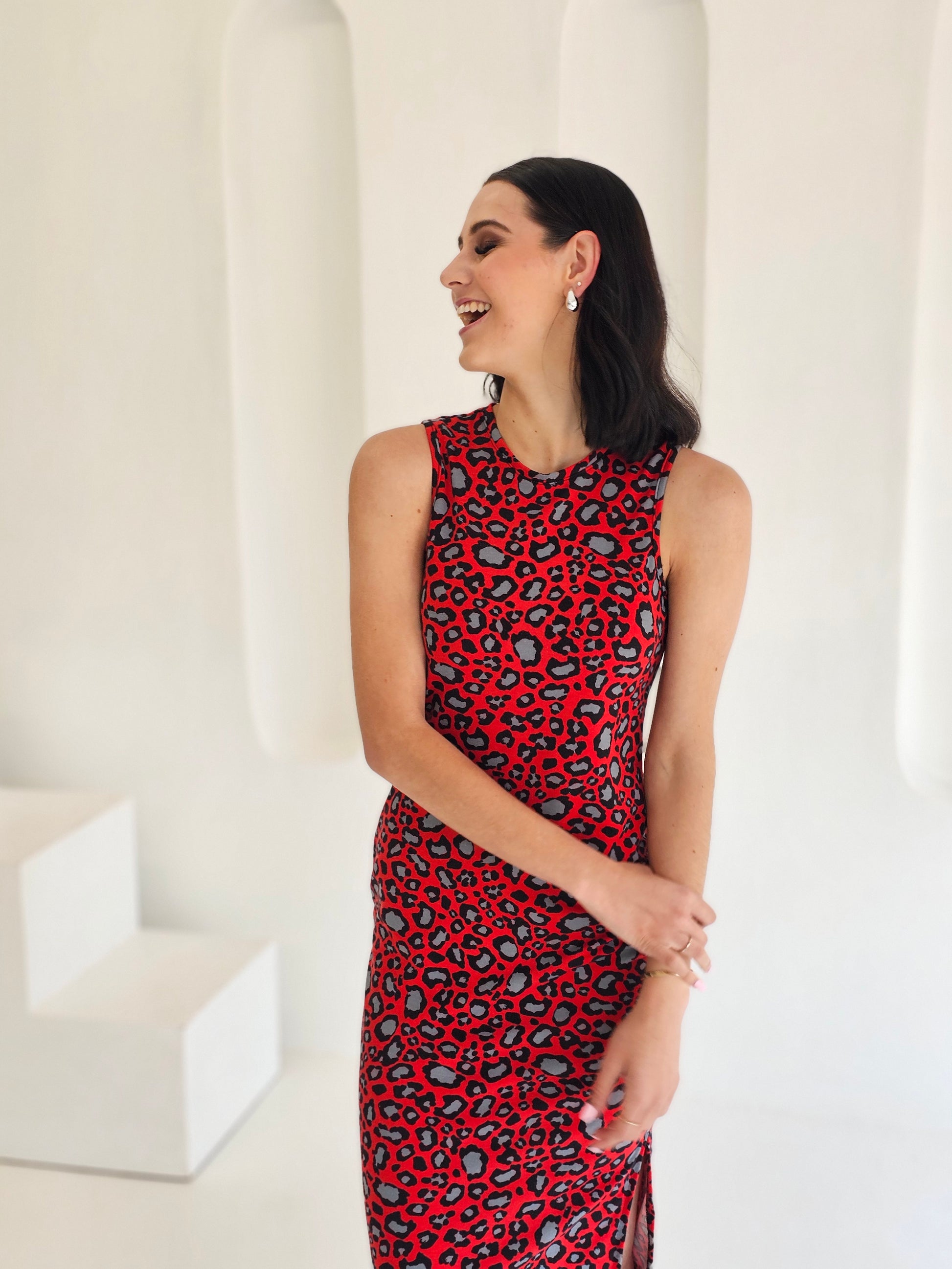 Straigh down sleeveless tshirt dress with a red leopard print. Dress her down with sneaker and a demin jacket or dress her up with high heels.